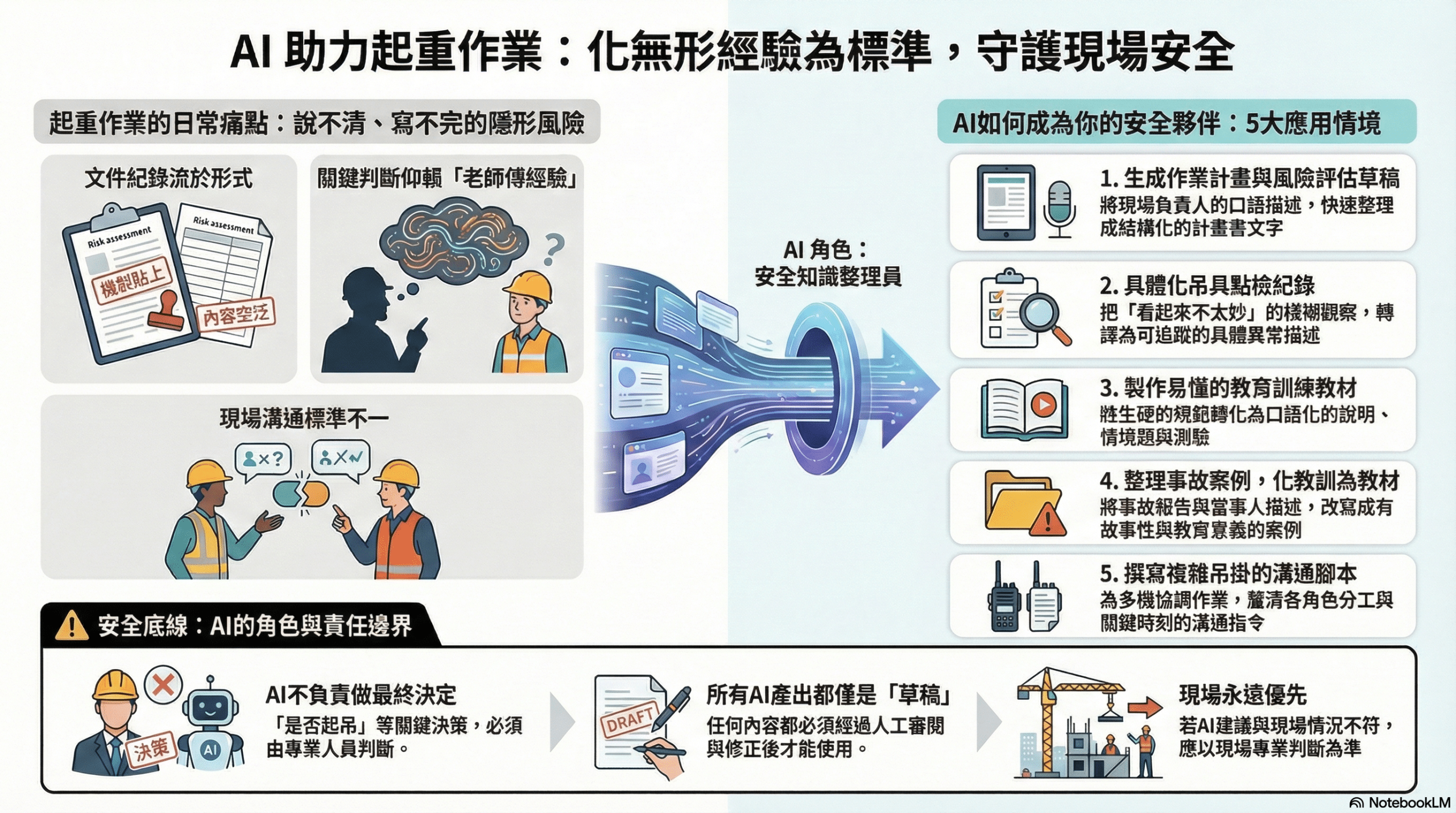 本單元主要介紹生成式人工智慧(AI)在產業起重機具應用方面的實務操作,內容介紹如何利用 AI 協助處理起重作業中的文件整理、風險評估與教育訓練等高風險領域的知識管理。具體案例包括使用 AI 產生起重作業計畫草稿、將吊具異常轉換成具體紀錄、製作標準化的指揮口令教材,以及將事故事件整理成有教育意義的案例文本。總體而言,本單元強調 AI 扮演「知識整理員」的角色,幫助現場人員將口頭經驗與模糊認知轉化為結構清晰、可追蹤的數位內容,從而提升起重作業的安全標準,並提供了從小處開始導入 AI 的實用建議。。